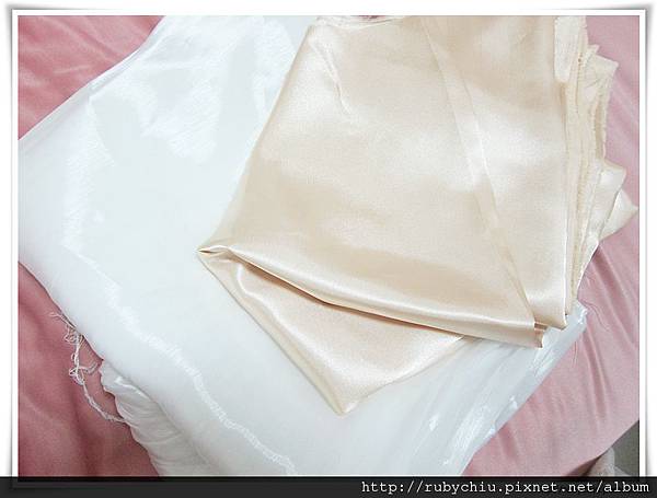 挑選了二塊,分別是珍珠白紗跟緞面的金色布料!我一直跟老公說可以再大塊一點~