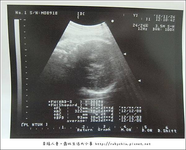 這次產檢,紀念品頭圍9.3mm,體重3000g! 羊水、胎盤都正常喔!胎頭有稍後下降,壓到膀胱了。
